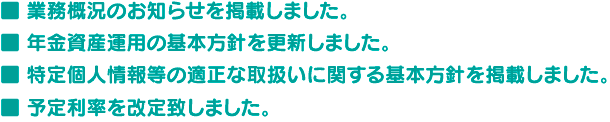 昨今の金利低下により、現在の経済環境に合わせ、平成29年1月1日より積立金の資産運用にかかる予定利率を3.5%から2.5%へ改定致しました。今後、更に安定性を重視し、着実な資産運用を進めて参ります。